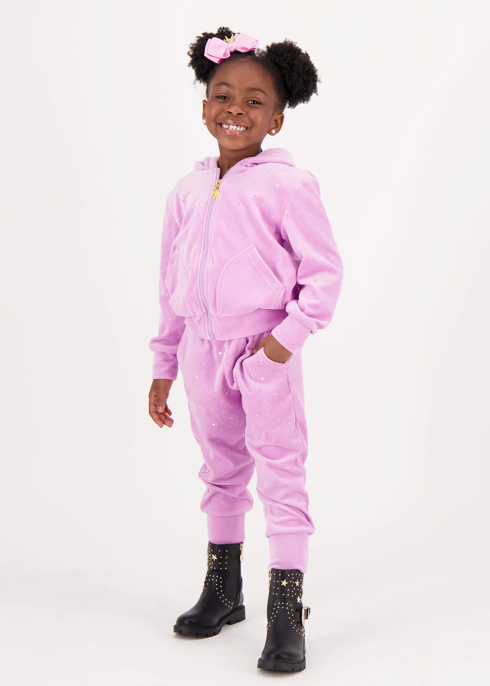 Luxuriously soft velour zip-up hoodie in Orchid Pink. The hoodie is embellished with crystals and fastens at the front with our iconic gold zip and heart puller. Pairs perfectly with our Bijou crystal joggers.