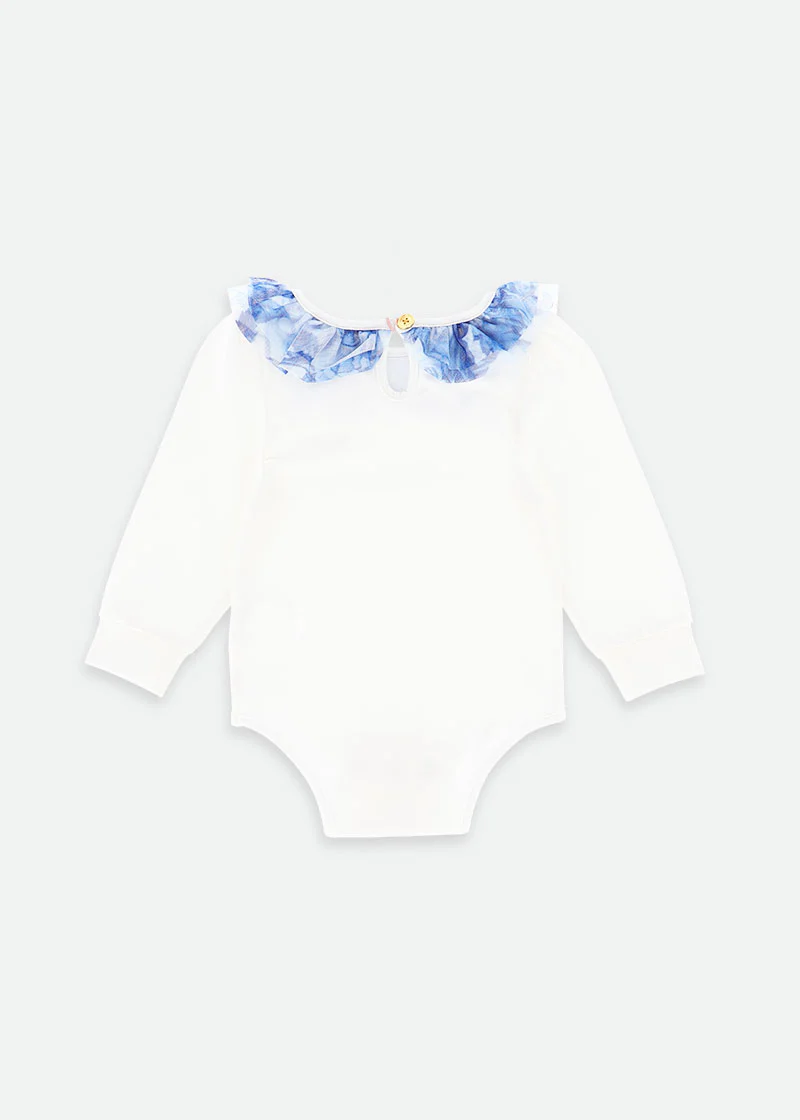 Adorable white long sleeve baby grow with a blue flower tulle collar, fastening at the crotch with comfortable poppers and logo button on the back neck. Baby grow is made from a soft cotton with a touch of elastane for extra stretch and movement, complete with our signature bow on the chest.