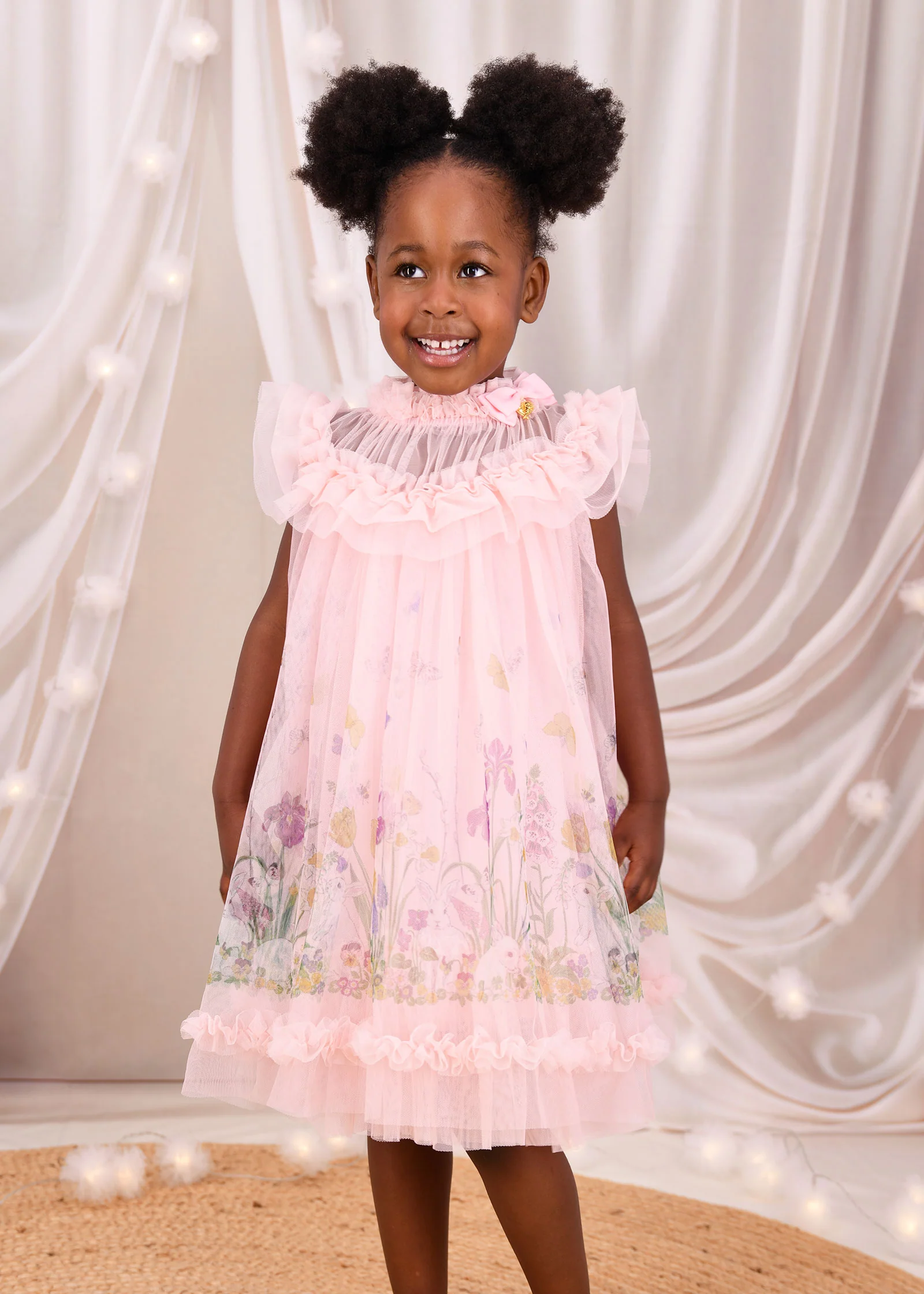Voluminous dress for girls in pale pink. Made from our adorable new season bunny print with a beautifully soft lining for added comfort. The dress features a front yoke with tulle ruffle detail and a frilled neckline and our signature bow and gold heart charm. Fastening at the back with a gold logo button.