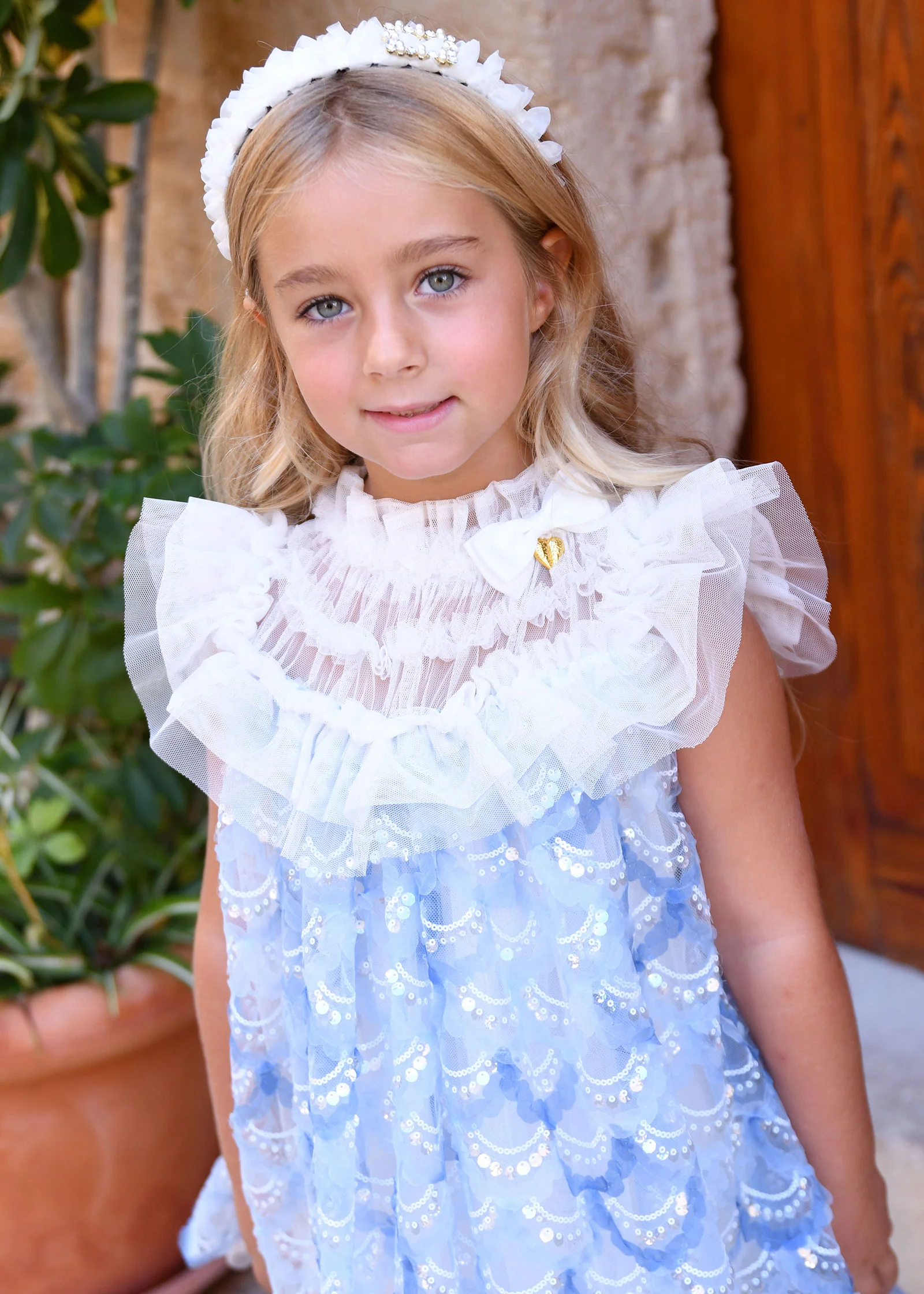 Voluminous dress for girls in snowdrop and pale blue. Made from sequinned and embroidered tulle with a beautifully soft lining for added comfort. The dress features a front yoke with tulle ruffle detail and a frilled neckline and our signature bow and gold heart charm. Fastening at the back with a gold logo button.