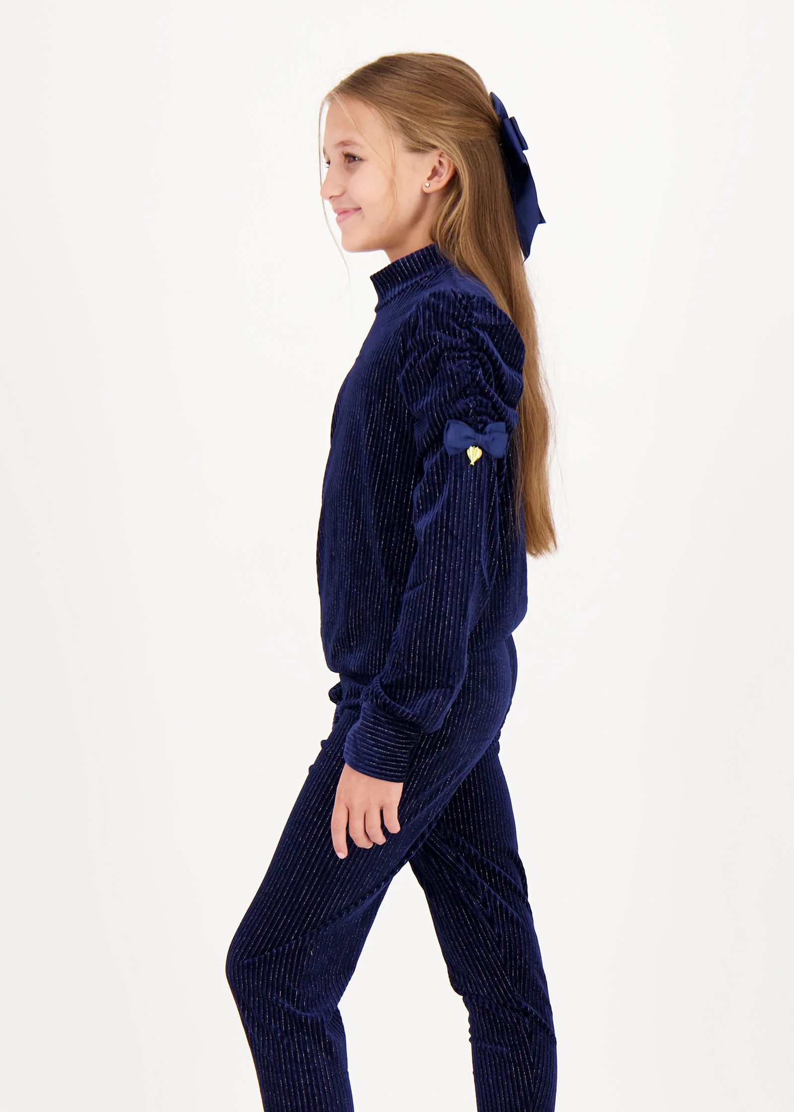 Luxuriously soft velveteen set in Navy. Detailed with glamorous puffed sleeves and deep cuffs. Ruched sleeves are finished with our signature bow and gold heart charm. Paired with comfortable leggings with an elasticated waistband.