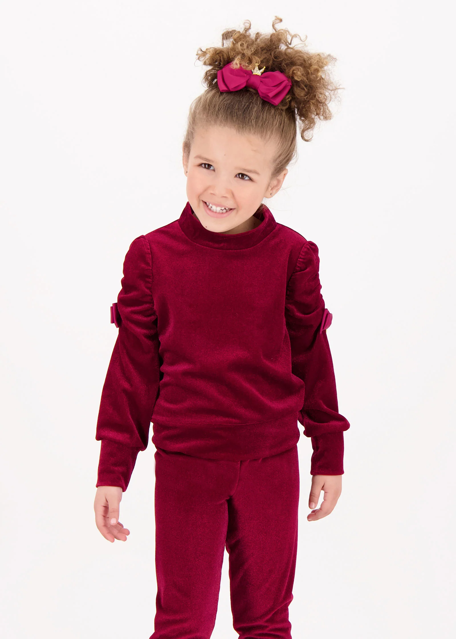 Luxuriously soft velveteen set in Port. Detailed with glamorous puffed sleeves and deep cuffs. Ruched sleeves are finished with our signature bow and gold heart charm. Paired with comfortable leggings with an elasticated waistband.