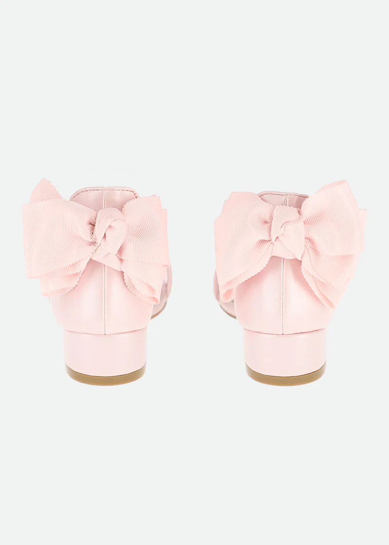 Girls special occasion heel sandals in pink. Stylish shoe is complete with our iconic bow on the back, 3.5 cm heel and fastens at the side with a diamanté heart buckle.