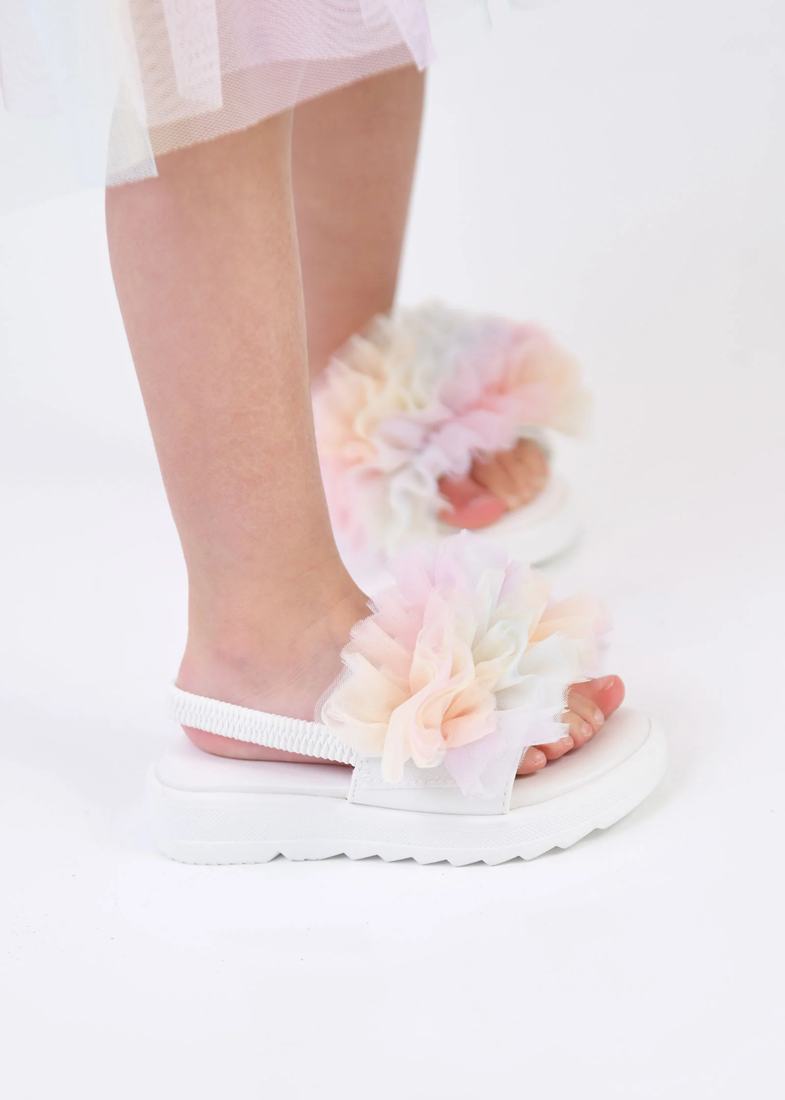 Stunning toddler white slider with rainbow tulle ruffle detail. This slider has a velcro strap on the front and a elasticated strap at the back for easy wear. Features chunky rubber soles for extra grip and a soft cushioned interior adding comfort.