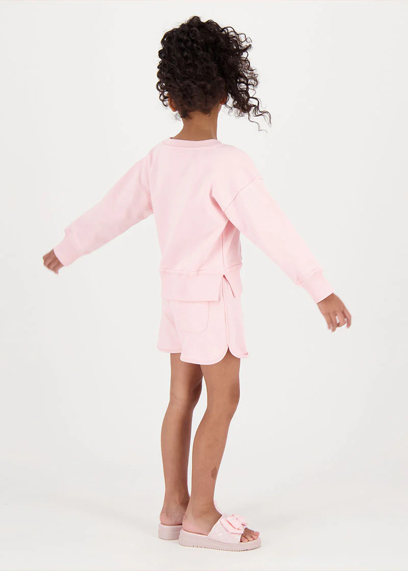 Pale pink sweatshirt with embroidery and diamante hot stone detail on the front. Made with a soft stretch ribbed waist neck. Relaxed fit sweat in soft cotton with ribbed cuffed details.