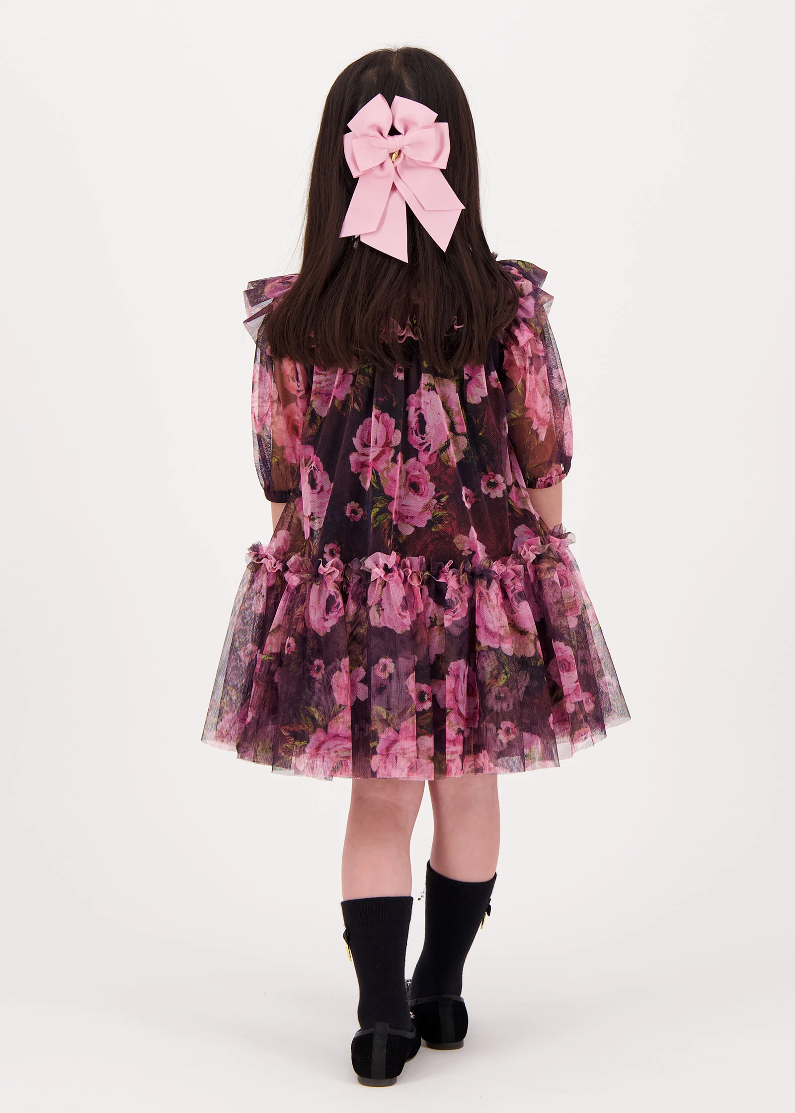 Make an entrance in this voluminous tulle party dress for girls. The luxurious tulle dress is detailed with this season's exquisite flower design, fully lined in a soft stretch cotton blend. The dress is complete with our signature bow and gold heart charm on the neckline, fastening at the back with a gold button.
