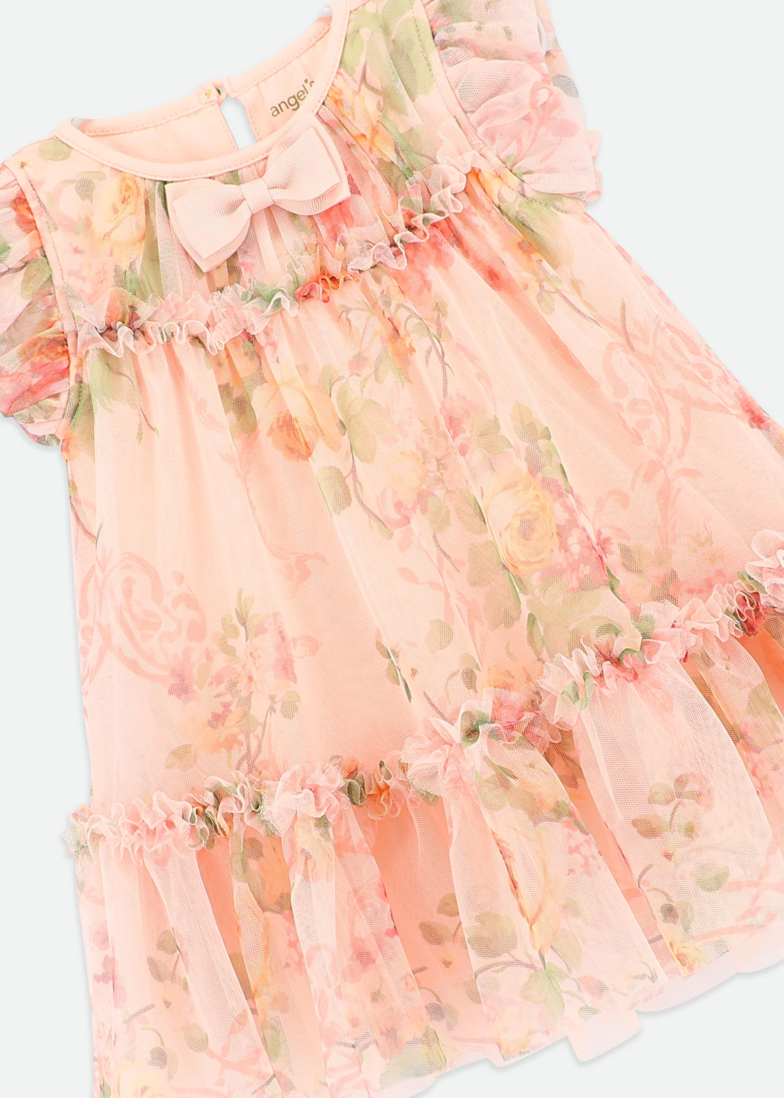 Voluminous tulle party dress for baby girls. This luxurious tulle dress is detailed with an exquisite flower design, fully lined in soft stretch cotton blend. The dress is complete with our signature bow and gold heart charm on the neckline, fastening at the back with a gold button.