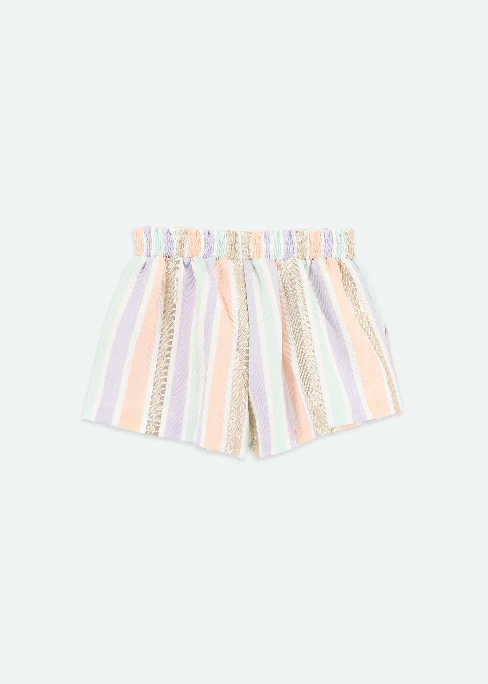 This dazzling summer shorts for girls in a striped jacquard. Featuring a ruched paper bag waist and complete with our signature bow and gold heart charm.
