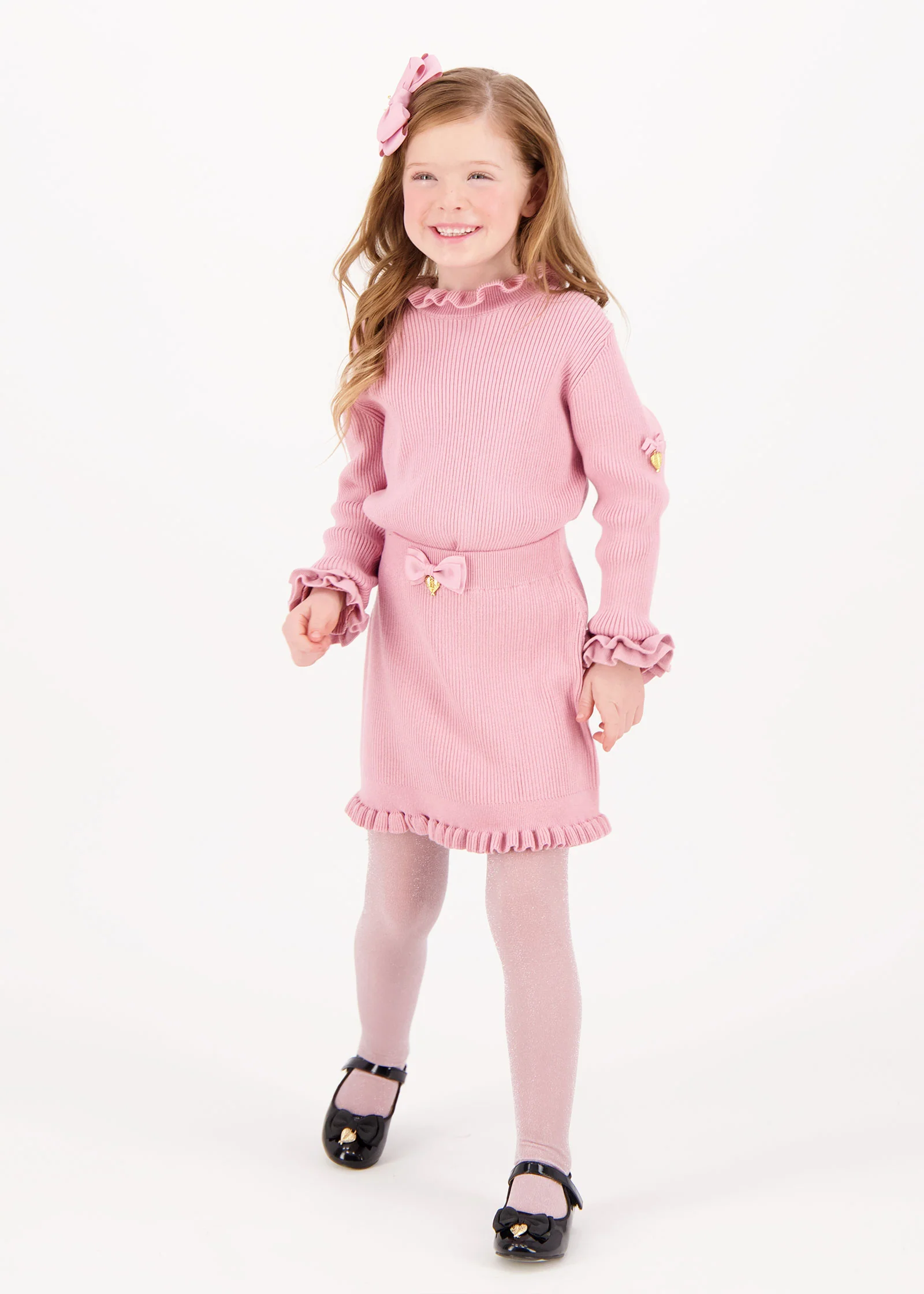 Girls Cotton Rib Knitted skirt in Tea Rose. Pairs perfectly with our Elma Jumper for a chic co-ord look. With a soft stretch elasticated waistband and is finished with our signature bow and gold heart charm on the waist.