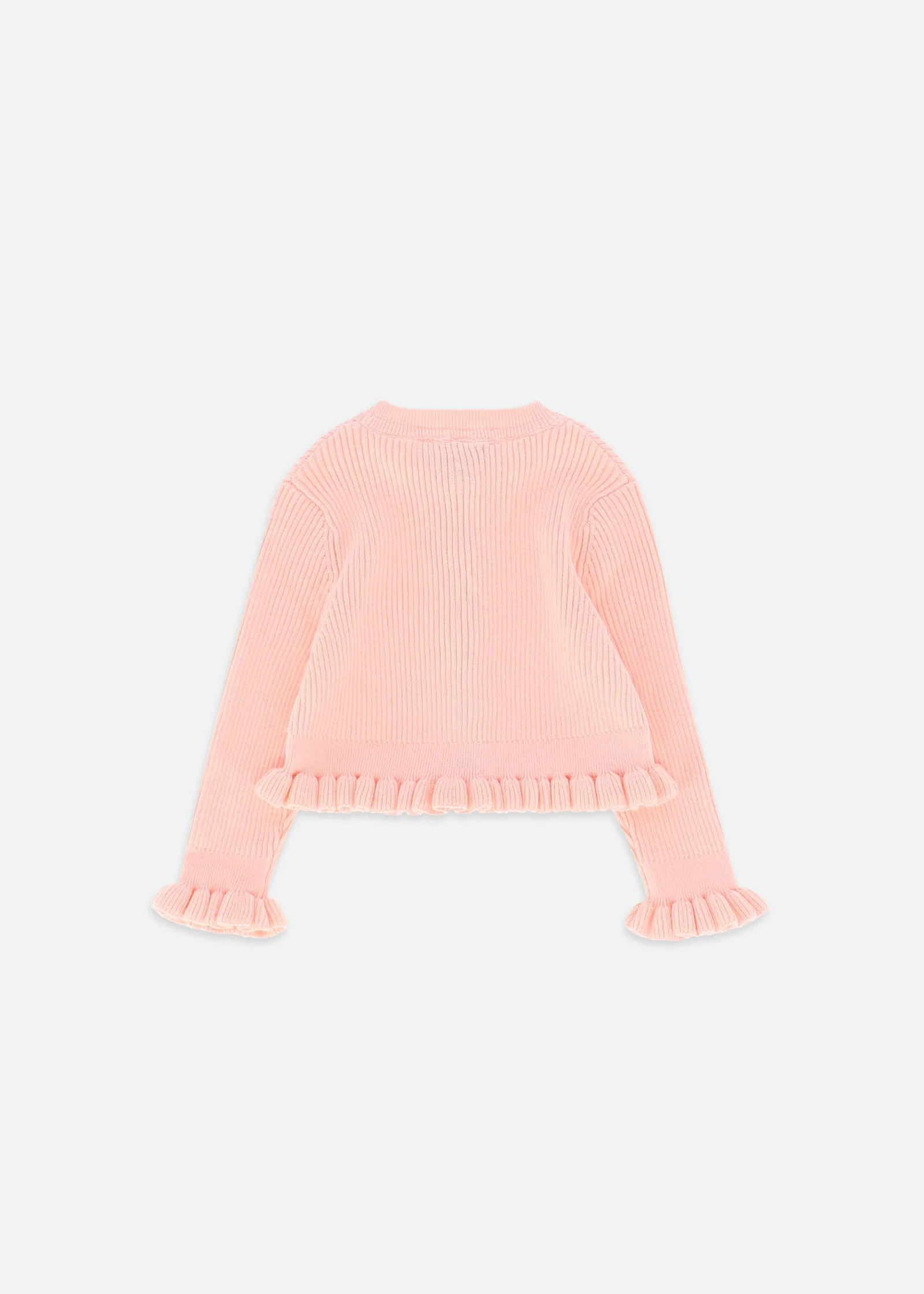Sweet Ribbed Vanilla Cardigan for girls. Designed in the softest cotton knit, this cardigan is edged with a fabulous frill on the waist and cuff. Fastens at the front with cute bow press studs.